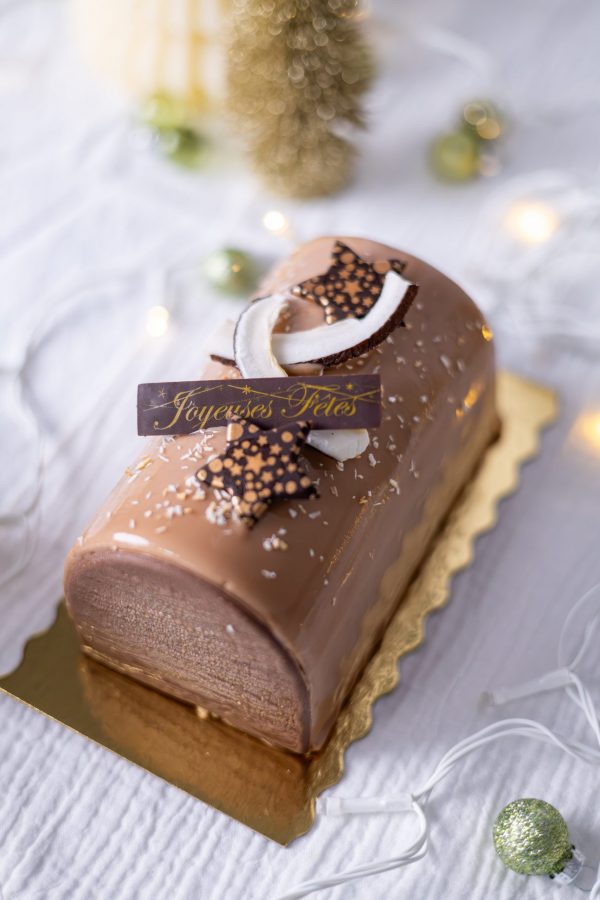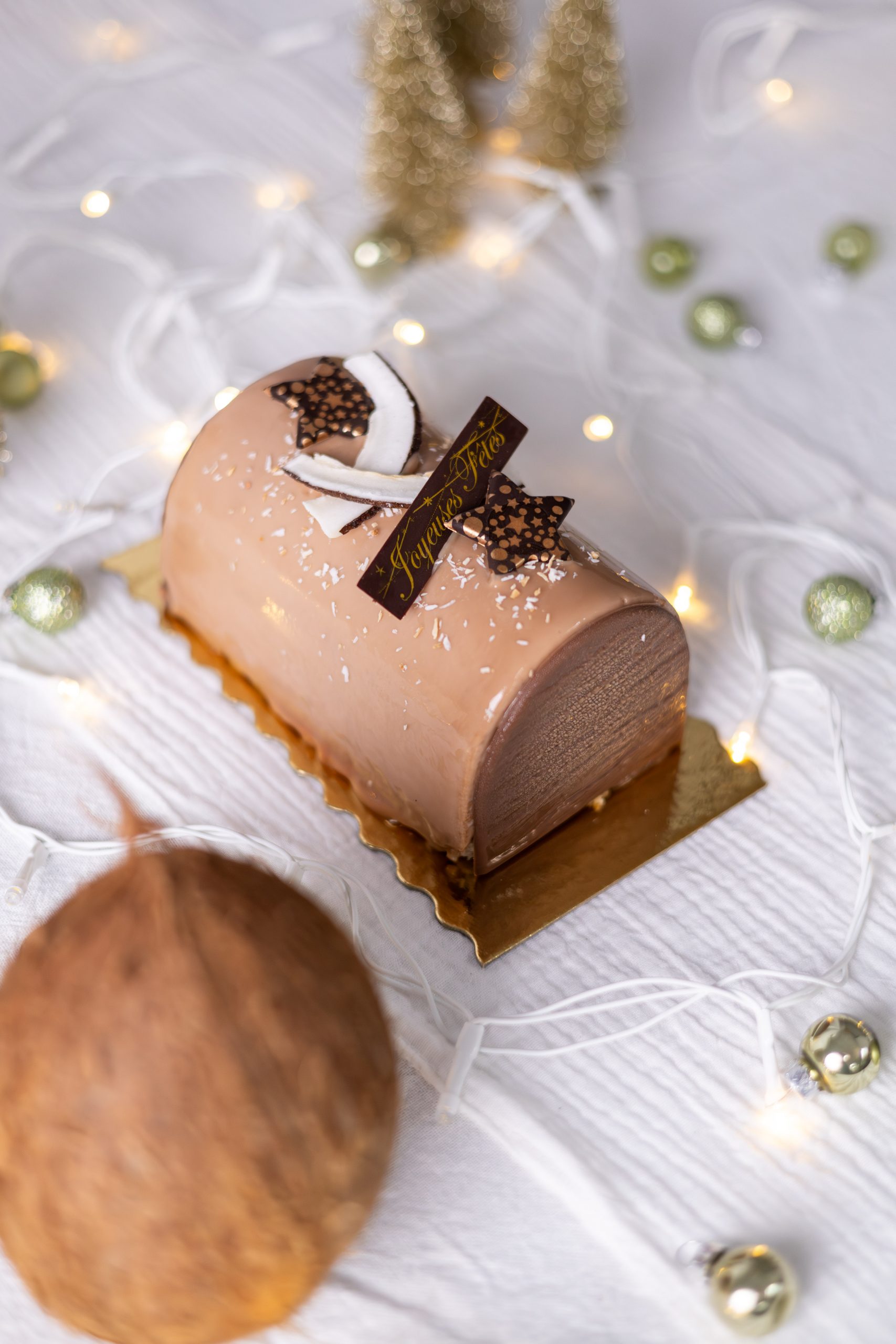 Mariage parfait entre la gourmandise du chocolat et la douceur exotique de la noix de coco, cette bûche séduit les amateurs de desserts raffinés et généreux.